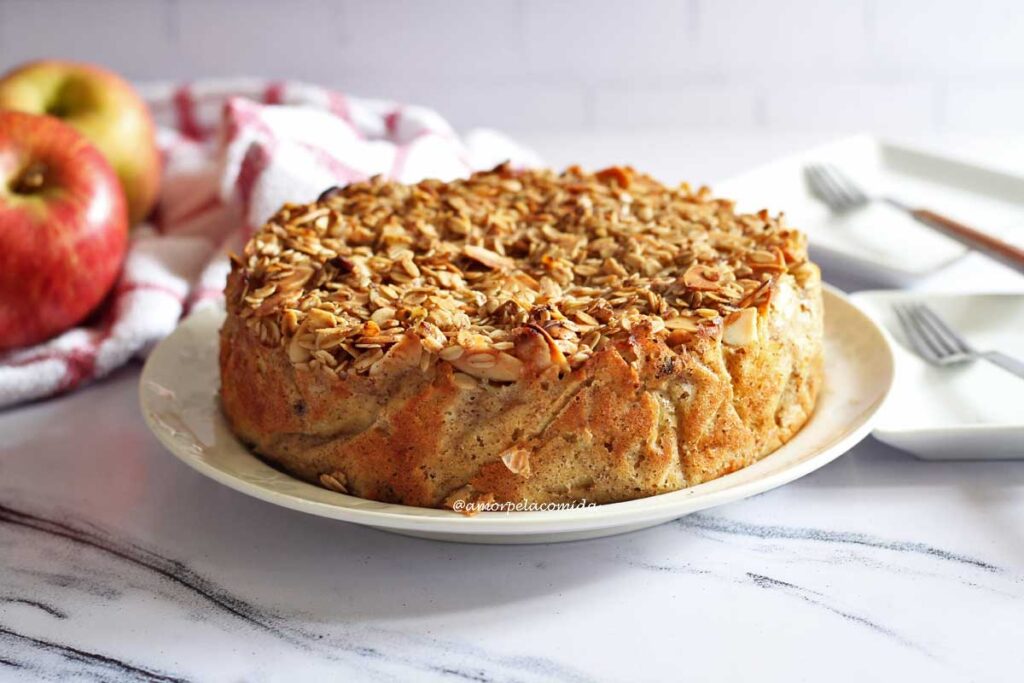 A torta é repleta de maçã, com pouca massa e zero açúcar, sendo uma opção deliciosa e equilibrada.